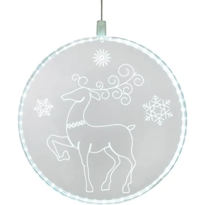 Mit der weihnachtlichen LED-Acrylscheibe Rentier verschönern Sie Ihr Fenster oder setzen einen festlichen Akzent an Zimmer- und Hauswänden. Umrandet von Lichtern zeigt die Scheibe ein verspielt gestaltetes Rentier und hübsche Schneeflocken. Sie besitzt einen Ø von 30 cm. Das die LEDs verbindende Kabel ist transparent und hebt das Bildmotiv in den Vordergrund. Die Dekoration lässt sich im Innen- und Außenbereich anbringen. Die Länge der Zuleitung beträgt 300 cm.