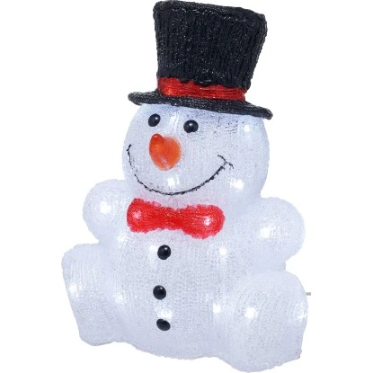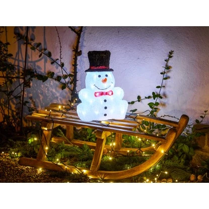 Die detailreiche Optik des LED-Schneemanns mit Hut, Fliege und Knöpfen wird Sie begeistern. Er ist 32 cm hoch, bei einer Breite von 24 cm und Tiefe von 20 cm. Besonders niedlich ist die sitzende Körperhaltung mit gestreckten Armen und Beinen. Zur Herstellung der Weihnachtsfigur wird hochwertiges und pflegeleichtes Acryl verwendet. Die Figur ist für die Verwendung im für Innen- und Außenbereich geeignet.